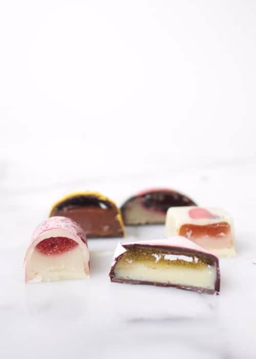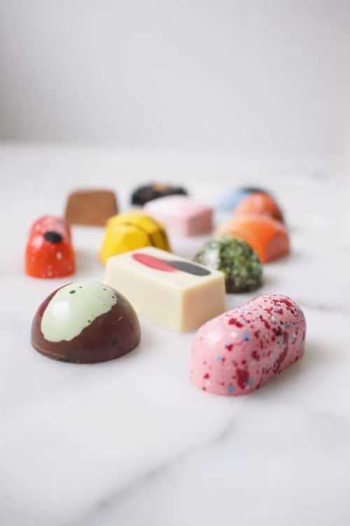 Je ziet dat er vanuit de keuken gedacht is qua smaakcombinaties en technieken en niet alleen maar van uit de chocolaterie. De combinatie gespecialiseerd kok en chocolatier werkt door in unieke smaken. Wat dacht je van rode biet – trekdrop, bergamot-tonkaboon of een combi van gember-mango-yoghurt? Of van de Funky Mush (shiitake) of de Asian Drip (soja, ponzu, wasabi en zwarte sesam). Bizarre smaken, maar neem van mij aan: ze werken!