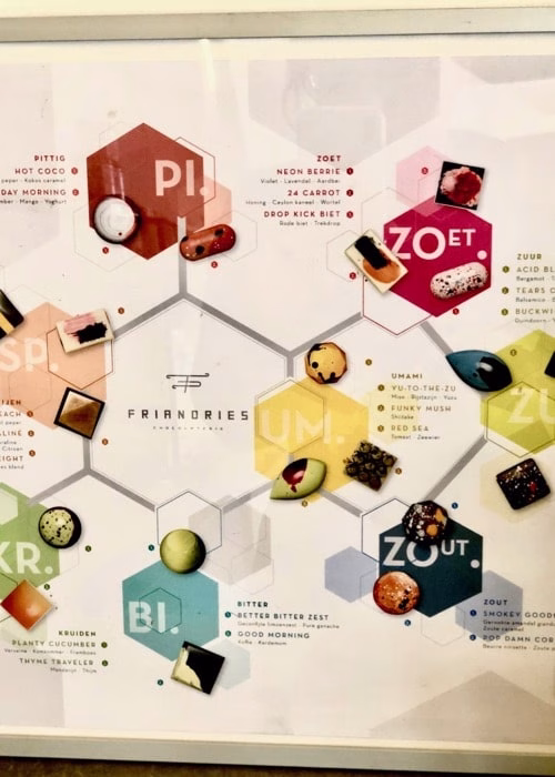 Friandries maakt verschillende smaakcombinaties die verre van traditioneel zijn. Opletten dus bij wat je proeft! Om nu een keuze te maken in het ruime assortiment zijn de bonbons gegroepeerd. Zoet, zuur, zout, bitter, kruiden, specerijen, pittig en umami. Dat zijn de acht smaakclusters waaruit je een keuze kunt maken. Herkenbaar aan het kleurlabel op het chocolademenu die een centrale plek in de winkel heeft. Maar kiezen is lastig, want ze lijken allemaal interessant en hoe weet je nu de mood van morgen 😉 .