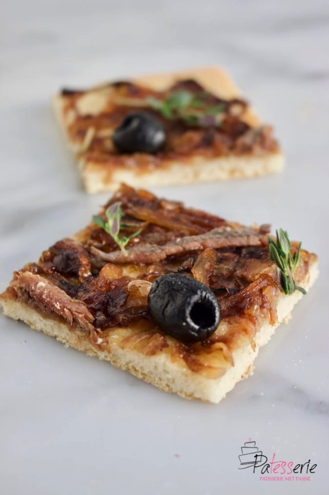 - Bak de pissaladière in ca 20-25 minuten in de oven gaar en goudbruin.